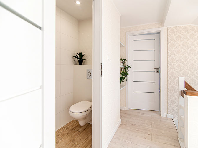 Piętro jest za to połączeniem funkcjonalności z przestrzenią sypialną. Dwa ustawne pokoje 13m2 i 14m2, a do tego wc z miejscem na pralkę i suszarkę. Dodatkowo znajduje się tam przestrzeń na gabinet, biuro lub pokój dla dziecka.